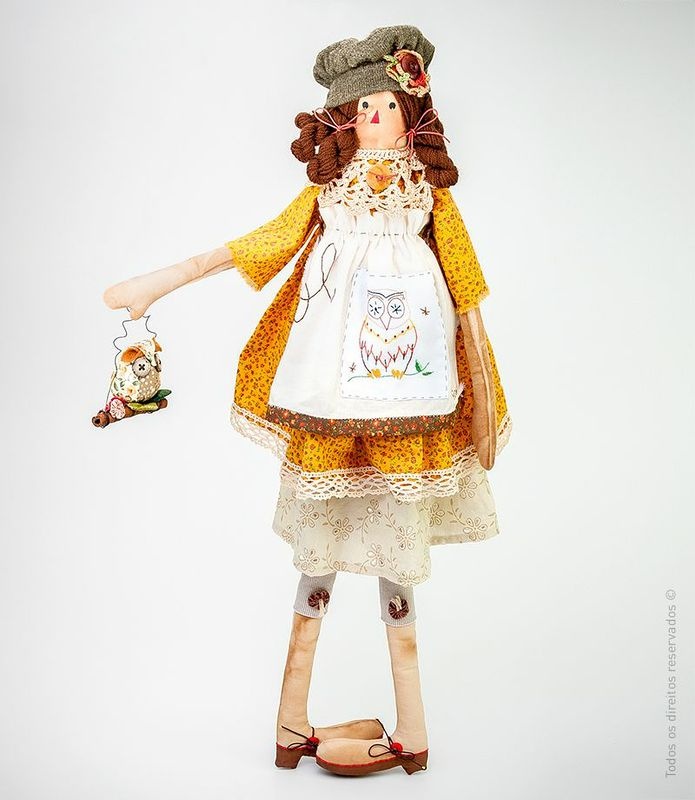 Boneca de pano segurando uma corujinha, confeccionada artesanalmente, um trabalho belíssimo e de excelente qualidade, da Cloth’s House.