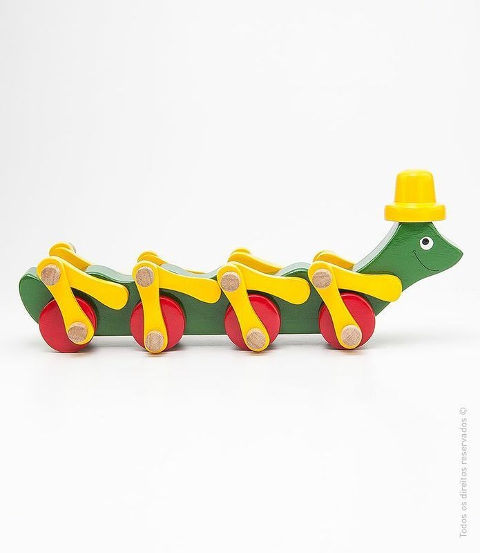 Lagarta articulada em madeira pintada. Quando puxada todas as perninhas se mexem.
